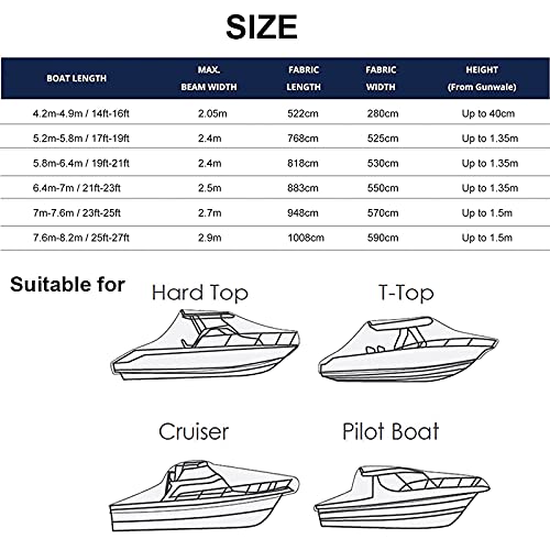 DIMENSIONI COPERTURA: 14-16 piedi: 522 cm * 280 cm, 17-19 piedi: 768 cm * 525 cm, 19-21 piedi: 818 cm * 530 cm, 21-23 piedi: 883 cm * 550 cm, 23-25 piedi: 948 cm * 570 cm, 25-27 piedi: 1008 cm * 590 cm, Adatto a V-Hull, Trihal, Barca da pesca, Bass Boat, Pro Style, Runabout. Si prega di fare riferimento alle istruzioni di misurazione per trovare la taglia giusta per la propria barca (se non si è sicuri di come scegliere la copertura giusta per la propria barca, si prega di contattarci)
