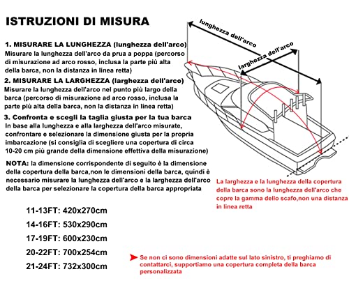 CINQUE DIMENSIONI: 420x270cm, 530x290cm, 600x230cm, 700x254cm, 732x300cm, si adatta alla maggior parte dei V-Hull, Tri-Hull. Prima di acquistare, misurare la barca in base alla tabella di misurazione fornita per scegliere una copertura per barca adatta