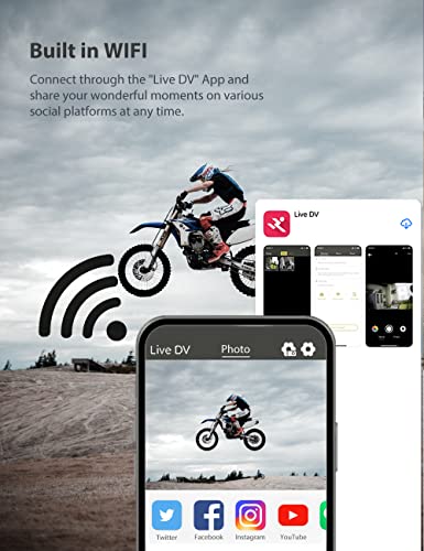 【Doppio Microfono & WIFI】: La action cam 4K dispone di un microfono integrato che può essere accoppiato con un altro esterno. Quest'ultimo permette una migliore cattura dei suoni di qualità più alta. Scaricata l'applicazione ‘Live DV', si può trasferire video e foto affascinanti sul telefono e condividerle su diverse applicazioni di social media a proprio piacimento e in qualsiasi momento.