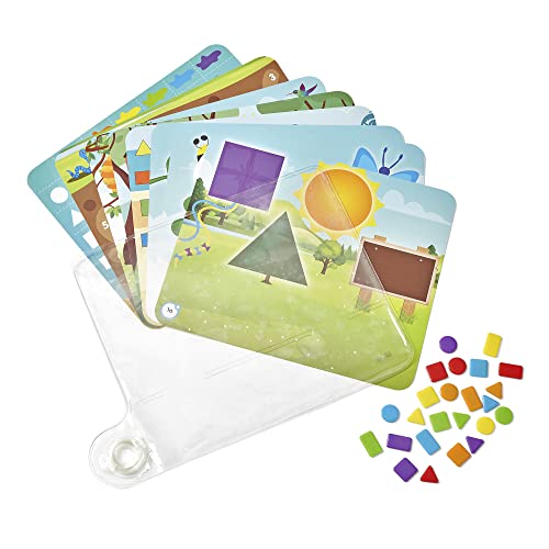 COMPRENDE: 1 cuscinetto sensoriale, 24 forme di plastica (4 diverse: cerchio, quadrato, rettangolo e triangolo, ognuna in 6 colori), 8 schede attività double-face e 1 Guida alle attività