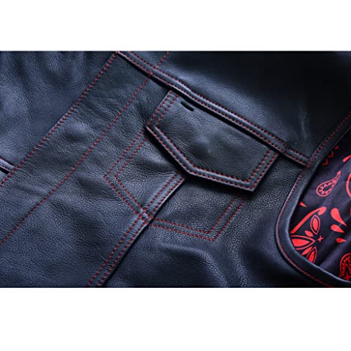 Cuciture rosse senza tempo: questo gilet da motociclista da uomo nero è sapientemente rifinito con doppie cuciture rosse sulla parte anteriore e posteriore. Tutte le cuciture cutanee del gilet in pelle sono anche in rosso, il che li rende più attraenti e iconici per i motociclisti.