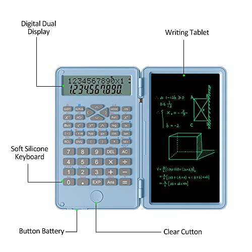 Questa calcolatrice scientifica per studenti integra il calcolo e il taccuino con una penna stilo. La tavoletta per scrivere lcd ti consente di prendere appunti durante il calcolo, il che è di grande aiuto per lo studio e il lavoro. Ottimo materiale scolastico portatile. Nota: l'area di scrittura e il pulsante di cancellazione funzioneranno solo sbloccando la CHIAVE DI BLOCCO.