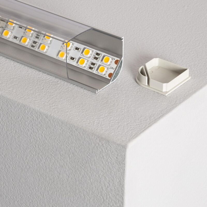 Profilo in alluminio anodizzato che permette un'installazione semplice ed elegante delle nostre strisce LED. Possono essere installati in tutti i tipi di installazioni con strisce LED in interni, appositamente progettati per proteggere e nascondere le strisce LED, permettendo installazioni professionali, pulite ed eleganti. I profili angolari sono realizzati in alluminio anodizzato di alta qualità e sono ideali per illuminare ambienti moderni con una luce indiretta pulita ed elegante. Incorpora la possibilità di montare una copertura opaca e traslucida, per creare un'illuminazione diffusa e dare alla vostra stanza un'atmosfera confortevole e accogliente. Per le applicazioni in cui è richiesta la massima luminosità, si raccomanda di montare una copertura trasparente. Incorpora una copertura continua fino a 10 metri per unire le sezioni di alluminio da 1 metro e formare una striscia continua di profilo. Caratteristiche del Profilo in Alluminio ad Angolo con Copertura Continua per