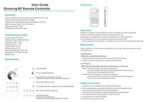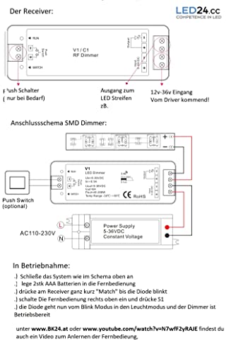 LEDmich Striscia LED SMD, dimmer radio, 2,4 GHz, con ricevitore e touch pin, telecomando 12 V, 24 V, dimmerabile da 5 V-36 V