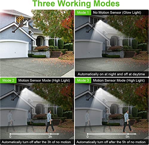 ☀ 【Funzioni e modalità multiple】 Il telecomando può controllare 3 ore + 5 ore + modalità automatica. Modalità automatica: l'illuminazione stradale solare Twilight funziona automaticamente con il sensore di movimento radar di notte. Si accende automaticamente per 30 secondi al passaggio di qualcuno, tempismo, regolazione della luminosità, comodo, risparmio energetico, nessun inquinamento