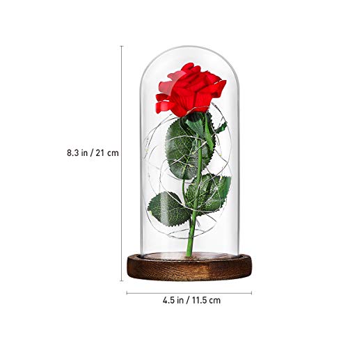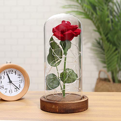 Ledmomo - Lampada con rosa di seta rossa e luce a LED, con petali caduti, in una cupola di vetro, su una base di legno, regalo perfetto per la festa San Valentino, matrimonio, compleanno, anniversario (1 rosa unica)