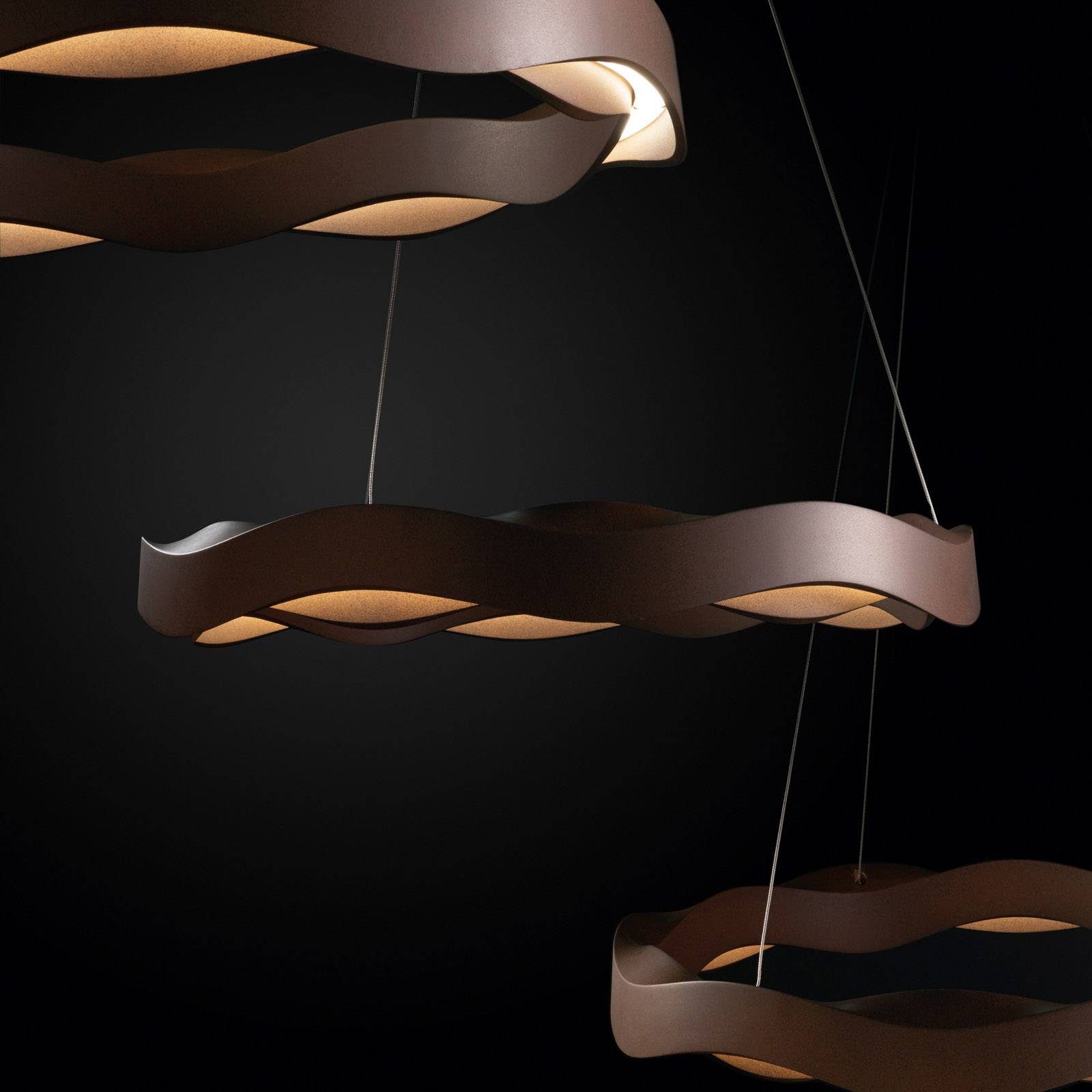 Lampada a sospensione a LED Hello con elemento paralume a forma di onda Questa lampada a sospensione evoca associazioni con le onde del mare attraverso la forma distintiva dell'elemento paralume a forma di anello. L'anello a forma di onda costituisce un'eccellente piattaforma per la luce emessa dai LED integrati. La loro luce attraversa la stanza come una dolce corrente. Ideale come illuminazione generale e da tavolo nel soggiorno, come illuminazione del foyer in un hotel e come fonte di luce per molti altri spazi pubblici. La luminosità della luce può essere regolata tramite un dimmer a controllo di fase fornito esternamente. È incluso un alimentatore elettronico. - Design: Josep Patsí