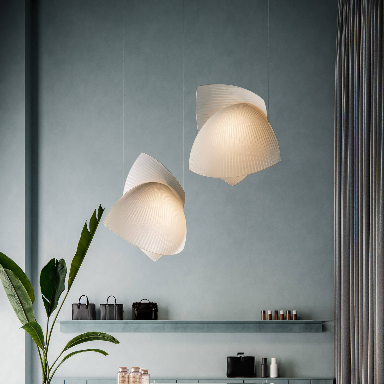 Lampada a sospensione LED Voiles con paralume in carta giapponese L'aspetto di questa incantevole lampada a sospensione LED Voiles può essere definito artistico. Irradia pura poesia con il suo delicato paralume in carta giapponese, e le sue notevoli dimensioni creano una presenza nella stanza a cui nessuno può sfuggire. Voiles è stata creata da Celine Wright e realizzata a mano a Parigi, la sua forma asimmetrica con le quattro diverse superfici, il cavo della lampada e la carta catturano la luce e dotano ogni stanza di un fascino unico. - dimmerabile: DALI