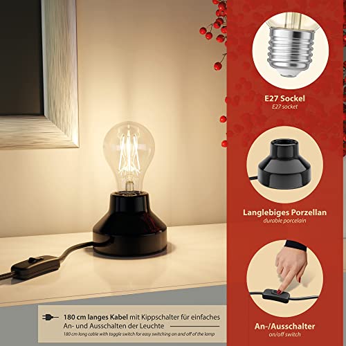 Ledscom.de Lampada da tavolo in porcellana E27 TIX, rotonda con spina e interruttore, nero, 90mm incl. lampada E27 660lm bianco caldo