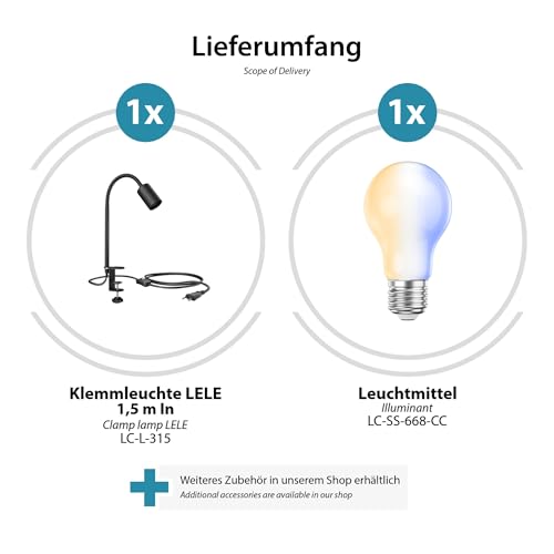 Ledscom.de 2 pezzi lampada a morsetto LELE con collo d'oca, nero E27 Lampada LED 918lm, Smart Home, bianco caldo - bianco freddo