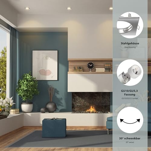 [Robusto alloggiamento in acciaio - L'alloggiamento dell'anello da incasso è in acciaio, il che rende il faretto estremamente robusto, resistente alla corrosione e durevole. Il materiale conferisce inoltre alla cornice un aspetto estetico e senza tempo, perfettamente integrabile in diversi stili di arredamento.