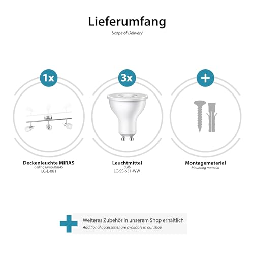 [Gamma versatile] - La lampada da soffitto MIRAS è disponibile in diverse misure e si adatta quindi a stanze di qualsiasi dimensione. Può essere facilmente montata sul soffitto ed è compatibile con quasi tutte le sorgenti luminose GU10.