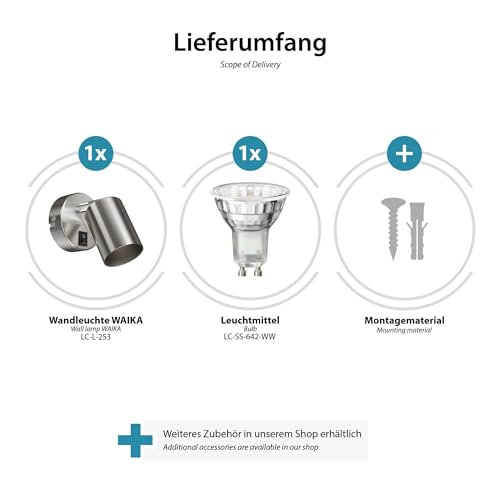 Ledscom.de 2 spot a parete WAIKA, a fiamma singola, con interruttore, GU10, cromo opaco, incl. lampada LED GU10 (bianco caldo, 2.339W, 227lm, 110°)
