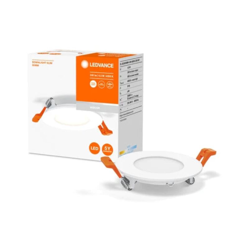 Faretto ad incasso led Ledvance Downlight Slim da 85mm 4.5W 4000K bianco - LUM573116 Faretto ad incasso led -Potenza: 4.5 W -Tensione: 220-240 V -Frequenza. 50/60 Hz -Temperatura colore: 4000 K -Flusso luminoso: 240 lm -Efficienza luminosa: 60 lm/W -Angolo fascio luminoso: 110 ° -Grado di protezione: IP20 -Dimensioni: 85 x 31 mm -Diametro foro: 72 mm Classe di efficienza energetica: E Ambiente consigliato: Interno Tipo di montaggio: Soffitto Forma Incassi: Tondo Diametro massimo del prodotto TONDO (cm): 8.5 Diametro del foro per incassare il prodotto TONDO (cm): 7.2 Grado di protezione (IP) parte incassata: IP20 Grado di protezione (IP) parte non incassata: IP20 Potenza in Watt (W): 4.5 Flusso della sorgente (Lumen): 240 Angolo di illuminamento (Gradi): 110 Colore della luce: Bianco Fascio di luce orientabile: No Temperatura Colore: Luce naturale Gradi Kelvin (K): 4000K (codice colore 21-840) Regolabile o dimmerabile: No Alimentazione: 220V-240V Fonte di alimentazione: Elettrica