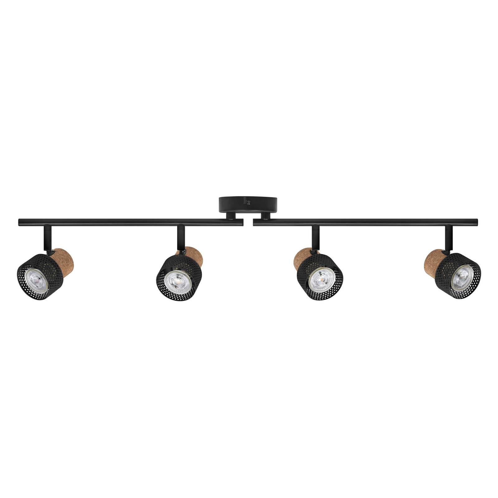 Faretto da soffitto Cork a 4 luci con sorgenti luminose GU10 dimmerabili Il faretto da soffitto Cork, dalla forma allungata e bipartita, si presenta con una bella combinazione di materiali. Mentre la struttura, compreso il rosone rotondo e i paralumi perforati, è in acciaio con finitura opaca, le parti posteriori del faretto sono rivestite in sughero. Il faretto viene fornito con una sorgente luminosa GU10 dimmerabile, i faretti LED possono essere sia ruotati che orientati e i due bracci, ciascuno con due faretti, possono essere anch'essi orientati. È ideale per l'uso in interni, ad esempio in corridoi e disimpegni, aree d'ingresso, soggiorni, cucine e molto altro ancora - versatile, personalizzabile e durevole grazie alle lampadine LED sostituibili - alloggiamento di alta qualità con finitura opaca - lampade OSRAM dimmerabili incluse - facile installazione - accessori di montaggio e collegamento completi inclusi