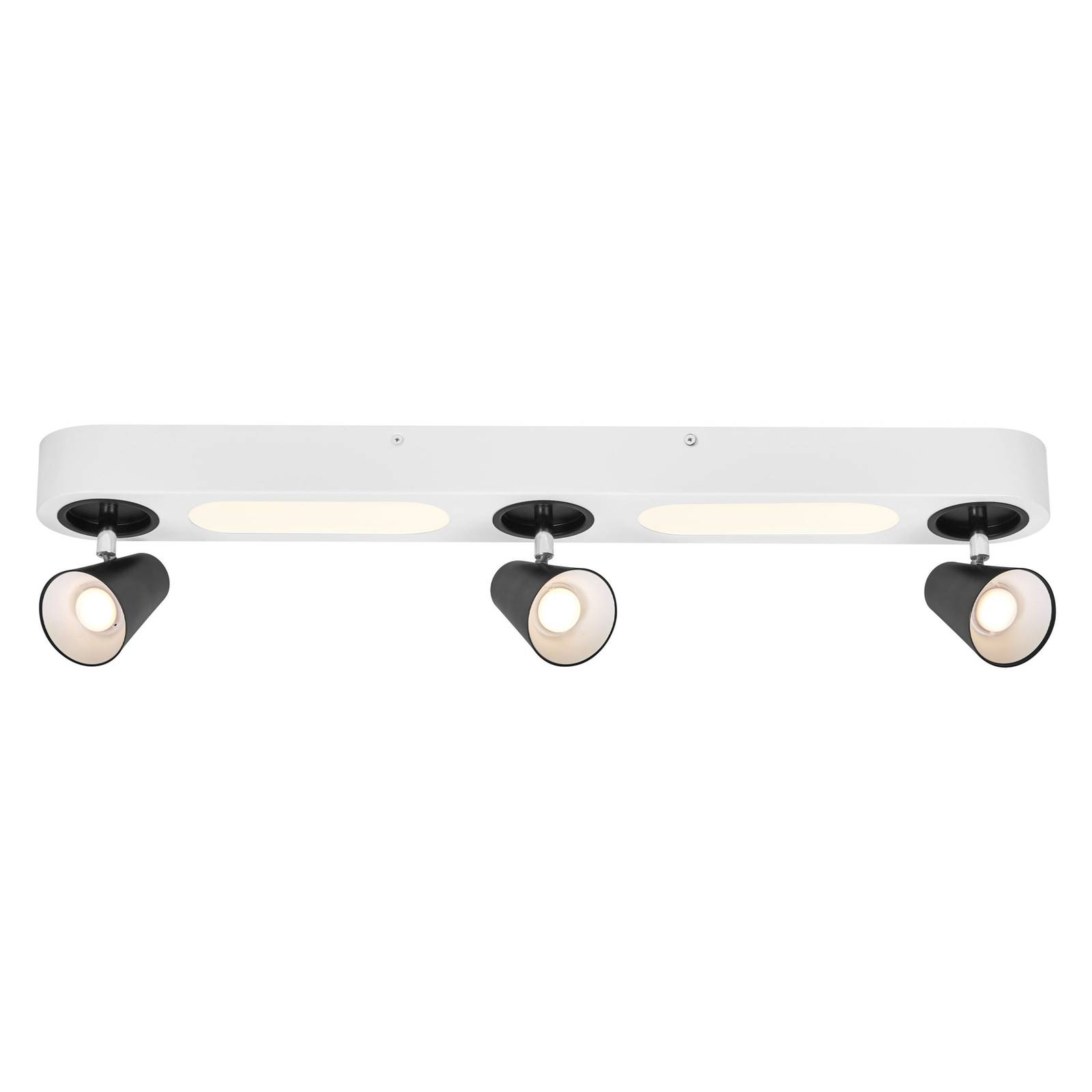Plafoniera Neptune LED con tre faretti e fonte luminosa nel baldacchino La plafoniera Neptune LED in acciaio è dotata di cinque fonti luminose: i LED bianco caldo sono stati installati nei tre faretti regolabili e nel rosone dietro le due coperture ovali in plastica satinata. Le sorgenti luminose possono essere accese separatamente o insieme utilizzando l'interruttore a parete. L'interruttore a 3 livelli (Click Select) permette di accendere l'illuminazione ambientale nel rosone, i tre faretti o entrambi insieme - Faretti orientabili - Accessori di montaggio e collegamento inclusi