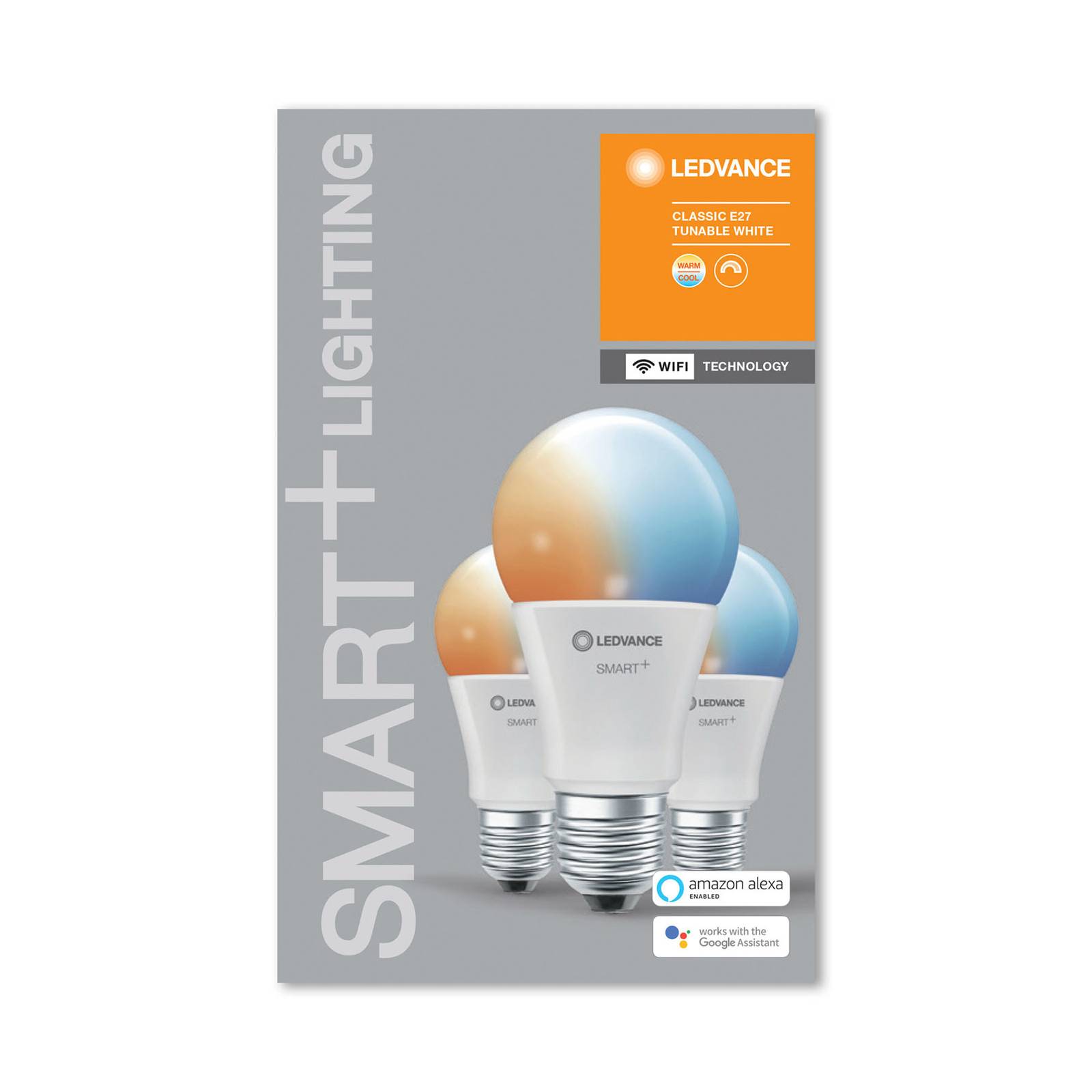Multipack con tre lampade LEDVANCE SMART E27 LED A60 da 9,5 W ciascuna, Tunable White, per il controllo tramite WLAN In termini di opzioni di illuminazione e controllabilità, questo set di 3 lampade LED E27 è al passo con i tempi. L'emissione luminosa e la temperatura di colore possono essere controllate a piacere tramite app o comando vocale. Grazie alla tecnologia SMART WiFi (che comunica tramite WLAN), ciò è possibile senza bisogno di un gateway o di un bridge. Caratteristiche speciali/compatibilità: - fornito in un set di 3 - controllabile con l'app LEDVANCE SMART WiFi (disponibile gratuitamente per iOS e Android);