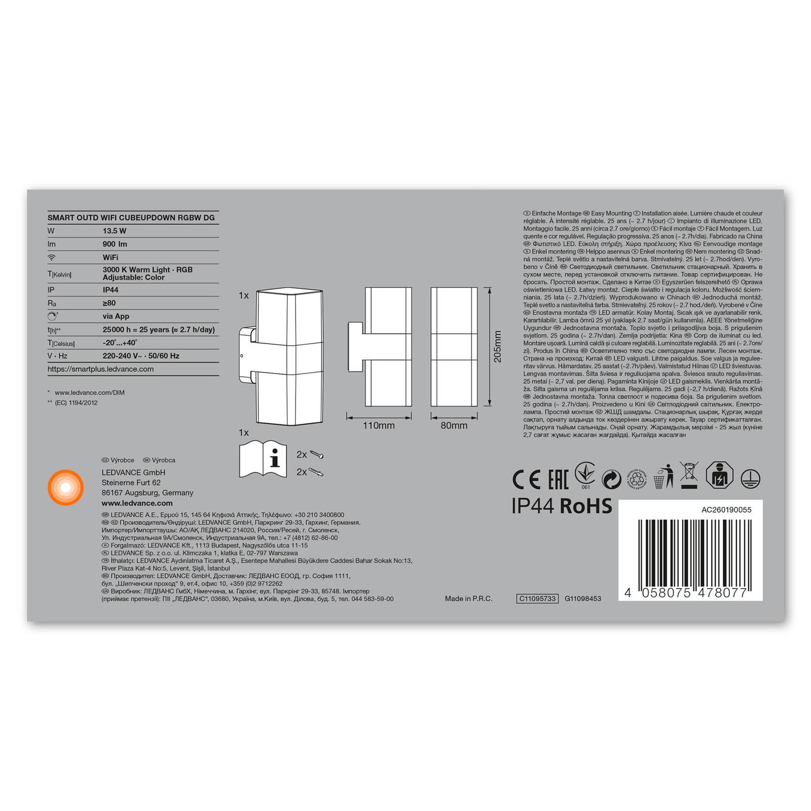 Moderna applique da esterno Cube con LED RGBW e tecnologia LEDVANCE SMART+ WiFi Come accento visivamente accattivante e fonte di luce funzionale per una maggiore sicurezza e un migliore orientamento, l'apparecchio da parete a LED per esterni Cube convince nel moderno design degli immobili. Il diffusore cuboide in policarbonato opale, che è sostenuto centralmente dal supporto a muro in alluminio grigio scuro, diffonde la luce in modo uniforme. Se necessario, la luce può essere commutata da bianco caldo a luce colorata in qualsiasi tonalità. Questo viene fatto, come l'intero controllo, tramite app o comando vocale. Grazie alla tecnologia LEDVANCE SMART+ WiFi, tutto ciò che serve è uno smartphone/tablet e il WiFi. Dati tecnici / compatibilità: - Controllabile con l'app LEDVANCE SMART+ WiFi (disponibile gratuitamente per iOS e Android);
