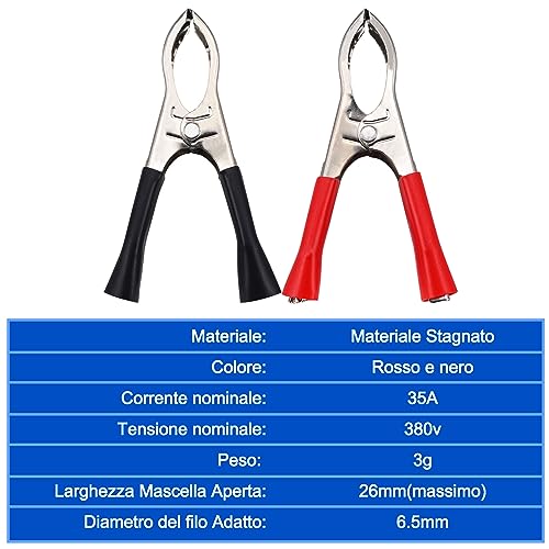 【Facile da usare】Le clip a coccodrillo standard si collegano e si disconnettono rapidamente e facilmente. Ideale per la ricarica della batteria a breve termine, basta agganciarlo e avviare immediatamente la ricarica. Una giacca rossa e nera può aiutarti a identificare le cariche positive e negative. La molla in metallo di alta qualità può sopportare una pressione maggiore, ha una forte forza di morso e non cadrà dopo il bloccaggio. Apertura massima: 25 mm.