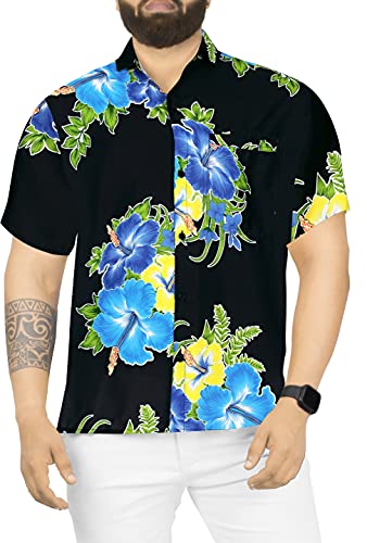 LA LEELA Shirt Camicia Hawaiana Uomo Manica Corta Hawaii Tasca-Frontale Stampa Hawaiano Casuale Regular Fit Ibisco Blu E Floreale XS