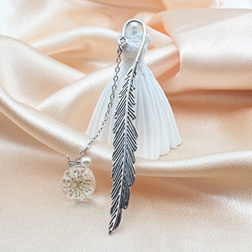 LEEQ Segnalibro in metallo con piume - 3 pezzi esemplare di fiori secchi piuma d'argento antico in metallo, è un regalo per lettori, ragazze, amici, compagni di classe