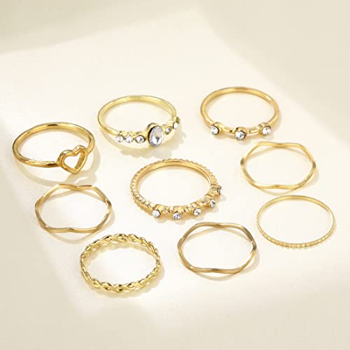 LEEQBCR Set di 9 anelli in oro per donne e ragazze,anelli in cristallo boho, onde, perle dorate, per donne e ragazze