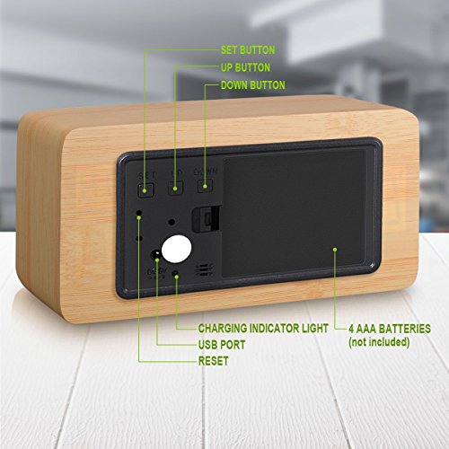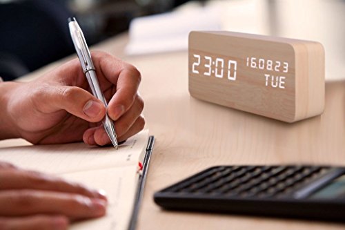 Leeron elegante orologio sveglia digitale a LED squadrato in legno, con data, temperatura, e funzione controllo vocale marrone