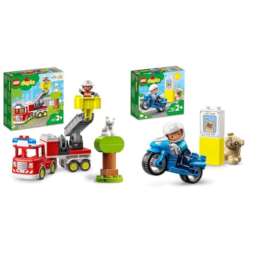 LEGO 10969 DUPLO Town Autopompa, Camion Giocattolo dei Pompieri con Luci e Sirena & 10967 DUPLO Motocicletta Della Polizia, Moto Giocattolo per Bambini dai 2 Anni in su