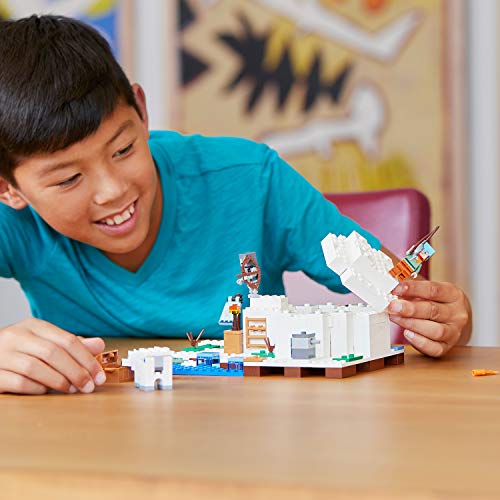 Contiene un igloo Minecraft costruibile in un paesaggio coperto di neve con alberi, piante e un'area con acqua e blocchi di ghiaccio, più uno stendardo decorativo e un dispenser di frecce