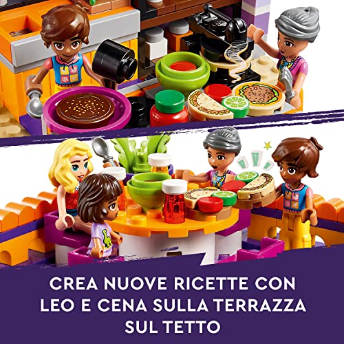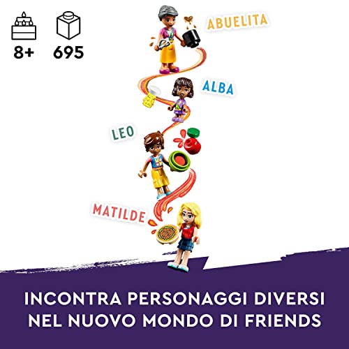 Include la famiglia LEGO Friends appassionata di cibo: Leo, sua sorella Alba e la nonna Abuelita, più la mini bambolina Matilde, il gatto Churro e tanti accessori