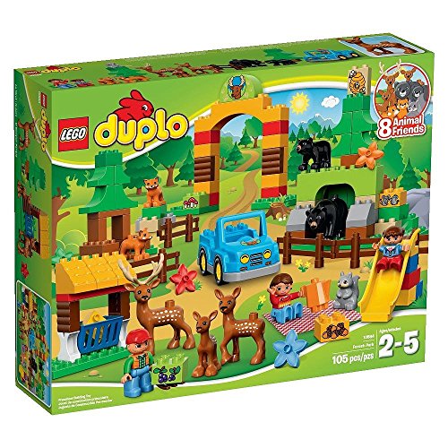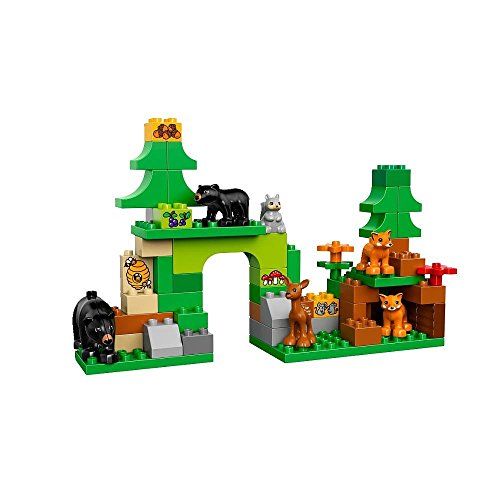 Include 3 personaggi LEGO Duplo: la mamma, il papà e il bambino, più 8 amici animali: un cervo, un daino, un orso, un cucciolo d'orso, 2 volpi e uno scoiattolo