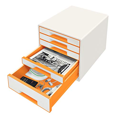 Leitz WOW Cube - Cassettiera 5 Cassetti, Formato A4 Maxi, 28.7 x 27 x 36.3 cm (A x L x P), Poliestere, Bianco/Arancione Metallizzato