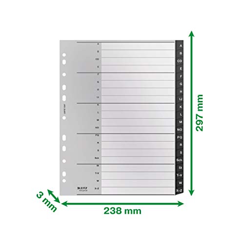 Leitz Indice, 20 Schede A-Z, Formato A4 Extra Largo, Plastica Riciclata al 90%, Ecologico, Qualità Premium, Gamma Recycle, Grigio, 12070000