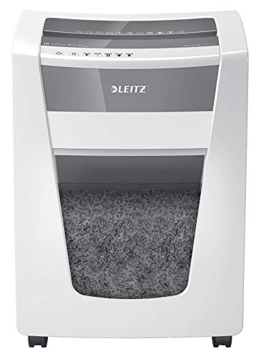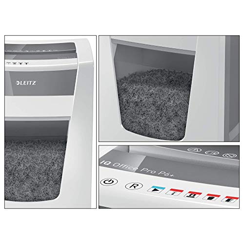 Leitz IQ Office Pro 80102000 - Distruggidocumenti CH, microtaglio, livello di sicurezza P6+, capacità 5 fogli, contenitore per rifiuti da 30 l, con spina svizzera, colore: Bianco