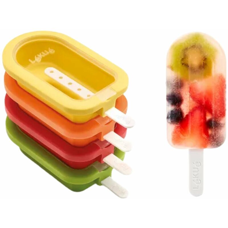 KIT 4 STACKABLE POPSICLES LéKUé Kit di 4 stampi impilabili per realizzare deliziosi ghiaccioli fatti in casa in modo semplice e salutare. Con questi grandi stampini a forma di lecca lecca preparerete in casa dei ghiaccioli con gli ingredienti che più vi piacciono. Il suo design di riempimento orizzontale lo rende molto più stabile, più facile e più sicuro, così anche i bambini possono preparare il proprio gelato. Gli stampini contengono un coperchio che proteggerà la preparazione da odori e sapori. Inoltre, grazie alla loro forma e allo stesso coperchio, sono impilabili tra loro per risparmiare spazio in freezer o quando li riponi. Sono molto facili da sformare, grazie alla flessibilità del silicone platinico, e sono lavabili in lavastoviglie . N.B. Include un bastoncino per ogni stampo, oltre a facili ricette di gelato senza lattosio e senza glutine. Dimensione: cm 12,5x7,5x2,7H Materiale: 100% silicone platinico + PP Temperature: -20°C / +100°C Capacità: cl 9,5 (x4) Appropriato