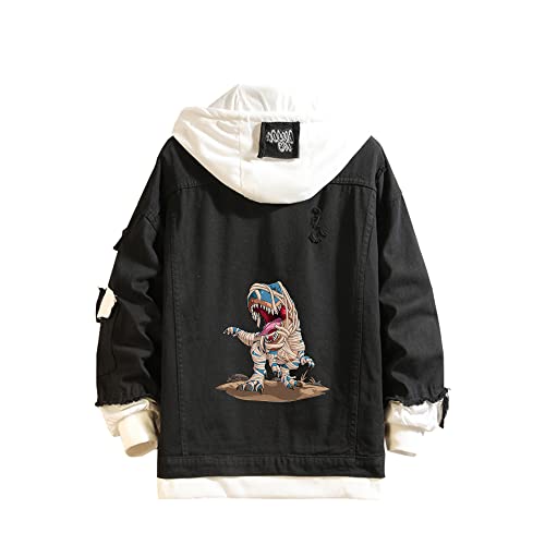 Giacca di jeans con cappuccio in denim stampa dinosauro natalizio realizzata in cotone denim + poliestere. La nostra giacca Y2K Button Down Trucker, tendenza alla moda, facile da abbinare a maniche corte e maglioni.