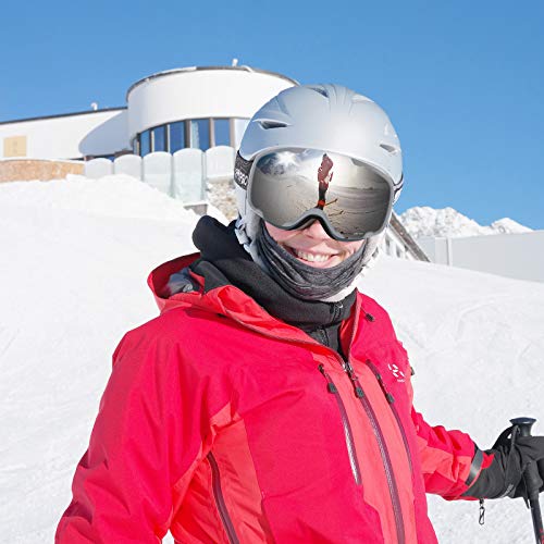 [Multifunzione] I grandi occhiali da neve a specchio offrono alla lente una protezione UV400 e ti proteggono da raggi UV, neve, acqua, vento, sabbia o polvere. Affinché gli occhiali non cadano dalla testa durante lo sport o lo sci, vengono fissati con un elastico antiscivolo. Gli occhiali da snowboard si adattano a tutti i caschi comuni grazie alla cinghia elastica, regolabile e antiscivolo