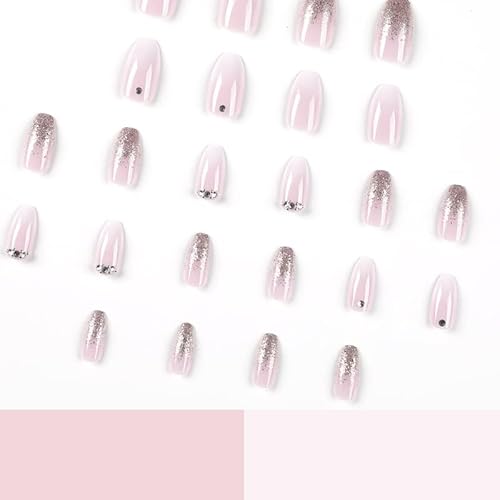 LEMEIZ Light Pink Ombre White False Nails with Rhinestone, Short Coffin Stick on Nails with Silver Glitter, Shimmer Bling Press on Nails Short,12 sizes, 24 pieces LEMEIZ-ST013