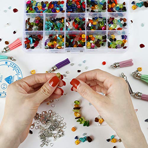 VARIETÀ DI COLORE E ACCESSORI: Questo perline pietre naturali kit include pietre di 15 colori, ricco assortimento. Anche gli accessori sono di multiple disponibilità, contengono le chiusure a moschettone, le frange di 12 colori, i cerchini, due rotoli di fili e delle mini perline. Bastano a soddisffare le vostre esigenze di design diversi stili di gioielli.