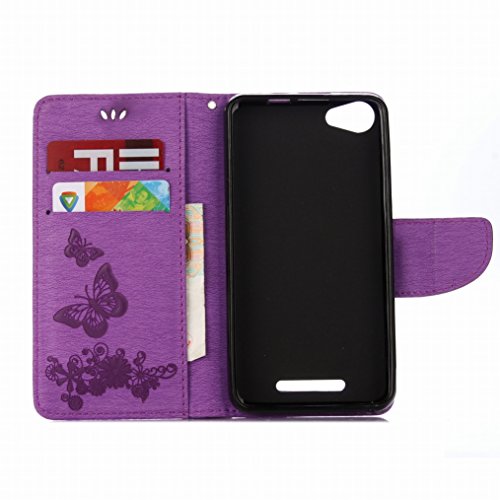 LEMORRY Per Wiko Jerry Custodia Pelle Cuoio Flip Portafoglio Borsa Sottile Protettivo Magnetico Chiusura Morbido Silicone TPU Cover Custodia per Wiko Jerry, Farfalla Fortunato Porpora