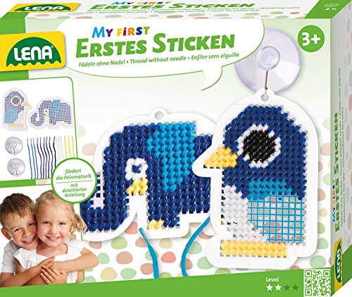 Lena 42623 - Set per il primo ricamo, motivo: animali, set completo con 2 griglie a forma di uccello e elefante, 10 lacci colorati, 2 ventose e istruzioni, per bambini dai 3 anni in su