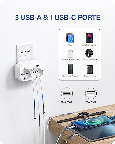 [Presa Universale] 15W USB C ricarica veloce è dotato di una porta di alimentazione USB-C e di una potenza di uscita 15W, che può caricare l'ultimo smartphone, telefoni cellulari e tablet a piena velocità. Presa AC: Potenza massima fino a 4000W (Massimo 250V, 16A), Uscita USB in Totale: 5V/3.4A, 5V/2.4A (Singola USB-A), Uscita USB C: 5V/3A