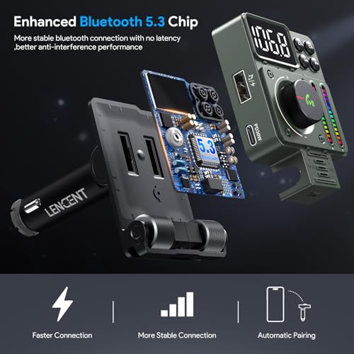 LENCENT Trasmettitore FM Bluetooth 5.3 per Auto, Adattatore Bluetooth Audio Radio, 30W PD Riarca Rapida, Musicale Regolabile di Alti e Bassi, Chiamata Vivavoce, Chiavetta USB, Siri & Google Assistante