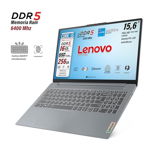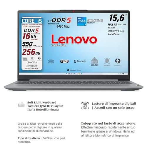 Lenovo, pc portatile Notebook, i5 12450H 12th, DDR5 16Gb, Display IPS FHD 15,6", SSD 256 Gb, Wi-Fi, Bt, USB Thunderbolt 4.0, Tastiera retroilluminata, fingeprint integrato, Win11 Pro, Pronto all'Uso