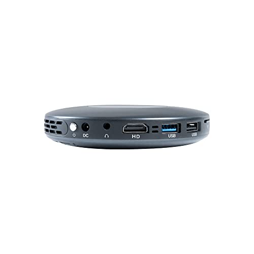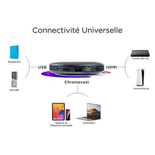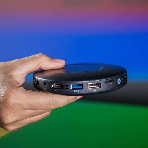 [IL MINI PROIETTORE CHE SI ACCOMPAGNE PARTOUT]: Goditi il tuo intrattenimento come hai sempre voluto. Lasciatevi sorprendere da questo mini proiettore di dimensioni circolari di 11,5 cm e di 1,6 cm di altezza. Dotato di una potenza di 70 ANSI lumen, consente di visualizzare video e immagini brillanti e supporta la risoluzione Full HD. Connessione wireless Bluetooth, Wi-Fi o cablata tramite cavo HDMI, presa audio, scheda di memoria SD, porta USB.