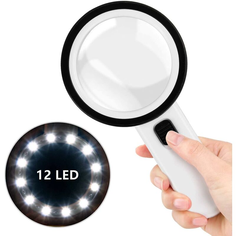 Specifiche: Ingrandimento: 30x Risorsa luminosa: 12 luci LED Dimensioni lente: 80 mm di diametro Batterie: 2 batterie AA (non incluse) Materiali: ABS + lente in vetro ottico Peso: 270 g Dimensioni: 205 mm x 106 mm x 27 mm Lunghezza manico: ca. 10 cm Il pacchetto include: 1 x lente d'ingrandimento a LED Nota: Si prega di non utilizzare batterie ricaricabili per evitare correnti troppo elevate che potrebbero danneggiare le luci a LED. Non guardare attraverso la lente d'ingrandimento per evitare di bruciarti gli occhi.