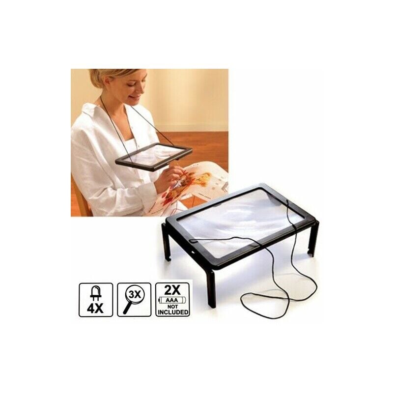 LENTE D'INGRANDIMENTODA COLLO E TAVOLO CON LUCE A LED PRATICO ACCESSORIO COMPOSTO DA UNA LENTE D'INGRANDIMENTO DI MISURA 275 X 200 mm DOTATA DI 4 LUCI A LED ALIMENTATE TRAMITE 2 PILE AAA (MINI STILO) NON IN DOTAZIONE. LA LENTE SI PUO' UTILIZZARE APPESA AL COLLO TRAMITE IL LACCIO IN DOTAZIONE PER AVERE LE MANI LIBERE, OPPURE POGGIATA SU TAVOLO CON LE GAMBE PIEGHEVOLI INCORPORATE. INGRANDIMENTO 3X