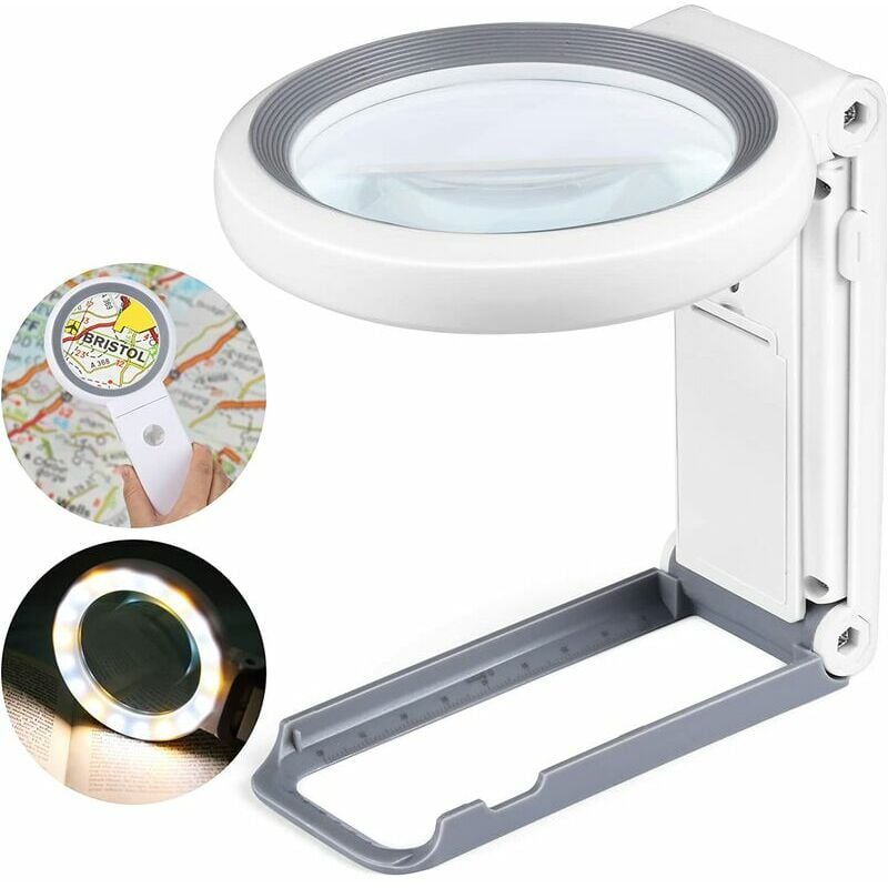 Ingrandimento ad alta potenza. Questa lente d'ingrandimento offre un ingrandimento da 30x a 10x, consentendo agli utenti ipovedenti di leggere testi di qualsiasi dimensione. Lente d'ingrandimento illuminata: dotata di 18 LED super luminosi di alta qualità per una luminosità extra per garantire una migliore esperienza di lettura Palmare o verticale. La lente d'ingrandimento può essere una lente d'ingrandimento portatile o da supporto. Il supporto pieghevole ti consente di stare su un tavolo, liberando le mani per un'esperienza di lettura più confortevole. Materiale del prodotto: ABS + lente in vetro (strato singolo) Ingrandimento del prodotto: lente grande 10x, lente piccola 30x Diametro lente: 82 mm per la lente grande, 21 mm per la lente piccola La confezione include: 1 lente d'ingrandimento Nota: la confezione contiene solo la lente d'ingrandimento, nessun altro elemento Il colore e le dimensioni possono variare leggermente a causa di fattori quali il monitor e la misurazione