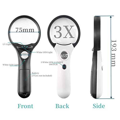 Lente d'ingrandimento 3X 45X con luce LED, alto ingrandimento con 3 LED e 1 luce UV, ingrandimento portatile per aiuti alla lettura, degenerazione maculare, monete, ispezione