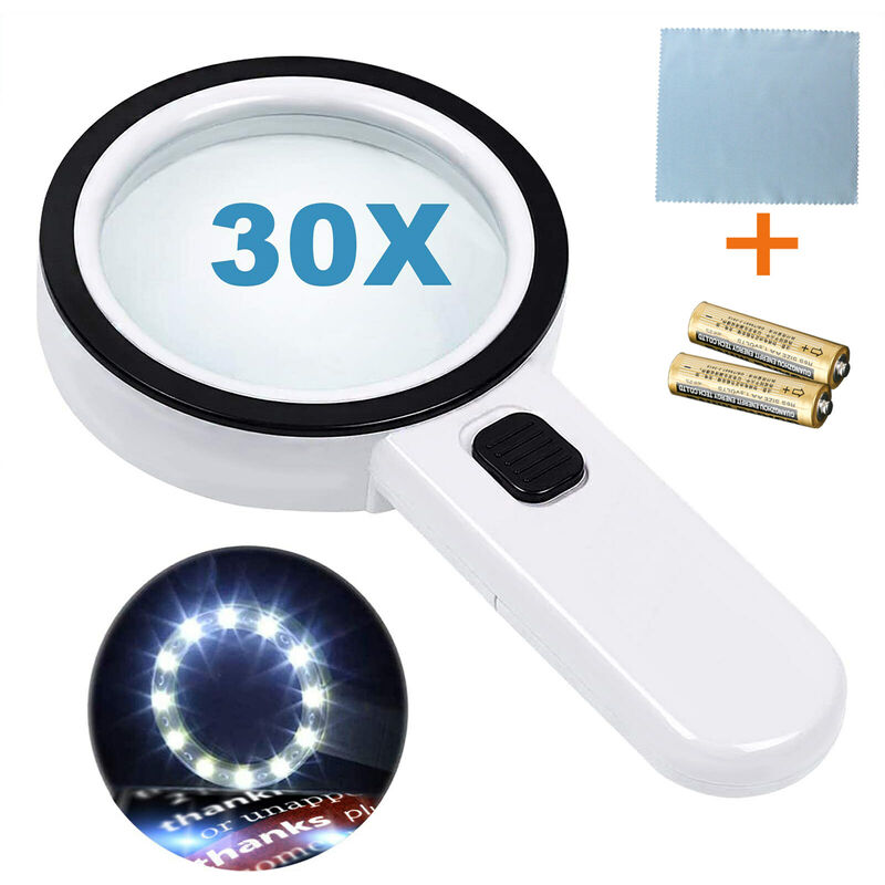 Descrizione. Elemento: Lente d'ingrandimento portatile con luce LED Ingrandimento: 30X Materiale: ABS, metallo, due lenti in vetro Tipo:lente d'ingrandimento LED Peso: ca. 270 g Luci LED: 12 LED Diametro: 80 mm Dimensioni: ca. 205 x 106 x 27 mm Batterie: 2 batterie AA Applicazioni: lettura, apprezzamento dell'antiquariato, lente d'ingrandimento del gioielliere Caratteristiche: design a doppia lente ottica di alta qualità nuovo di zecca< br /> Lente d'ingrandimento portatile con doppia lente ottica di alta qualità con luce LED. Ingrandimento 30x elevato con 12 luci LED per una visione più semplice. Design antiscivolo per un uso più semplice. Ideale per lettura di libri, lettura di giornali, oggetti d'antiquariato e lenti d'ingrandimento per gioiellieri. La confezione contiene. 1x lente d'ingrandimento ottica a LED 1x panno per specchi (colore casuale) 1x paio di batterie